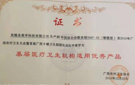 在此次大會上,蕪湖圣美孚科技有限公司生產的中醫綜合診斷系統SMF-Ⅲ(增強型)在2019年廣西農村衛生大會暨首屆廣西鄉鎮衛生院院長論壇中被評為“基層醫療衛生機構適用產品”。